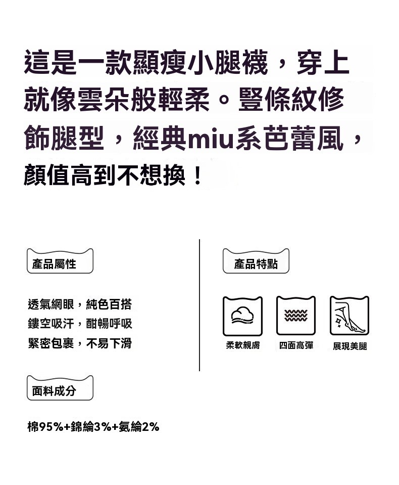 小腿長筒設計,舒適貼合不緊繃,輕鬆打造纖細腿部線條。