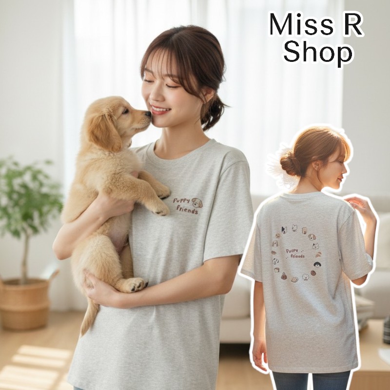 夏季日系小狗印花短袖T恤 純棉寬鬆圓領百搭 前後圖案 可愛 休閒 時尚 潮流 女上衣 n60003