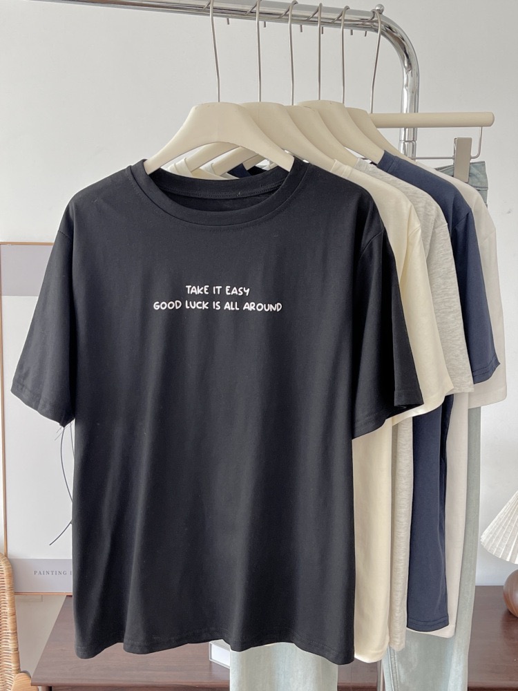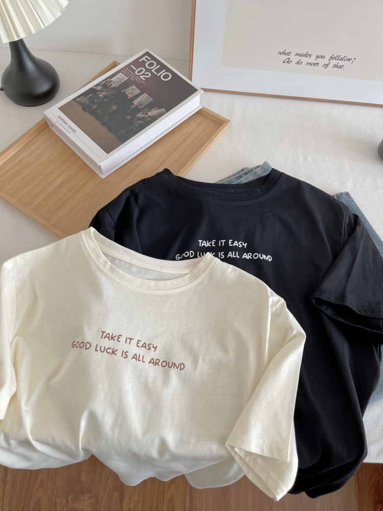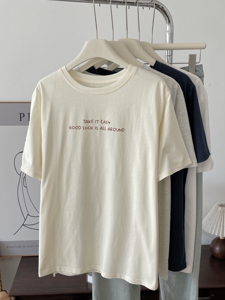 奶油杏色印花短袖T恤 女圓領寬鬆純棉 夏季薄款休閒上衣 韓版百搭 清新 氣質 時尚 潮流 n60007
