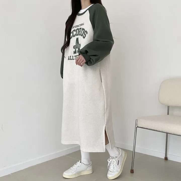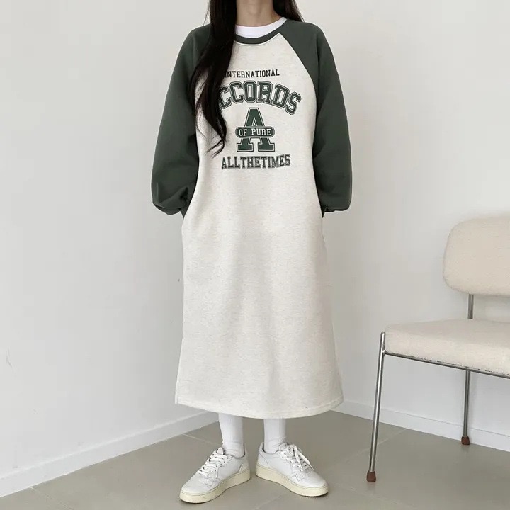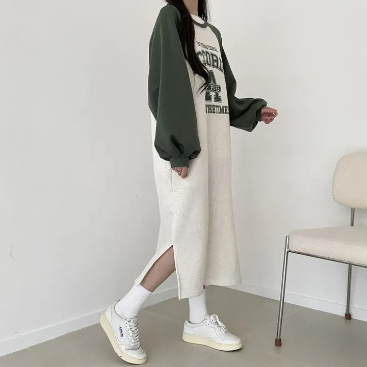 秋裝拼接系 日系風長裙 圓領袖連衣裙 n751