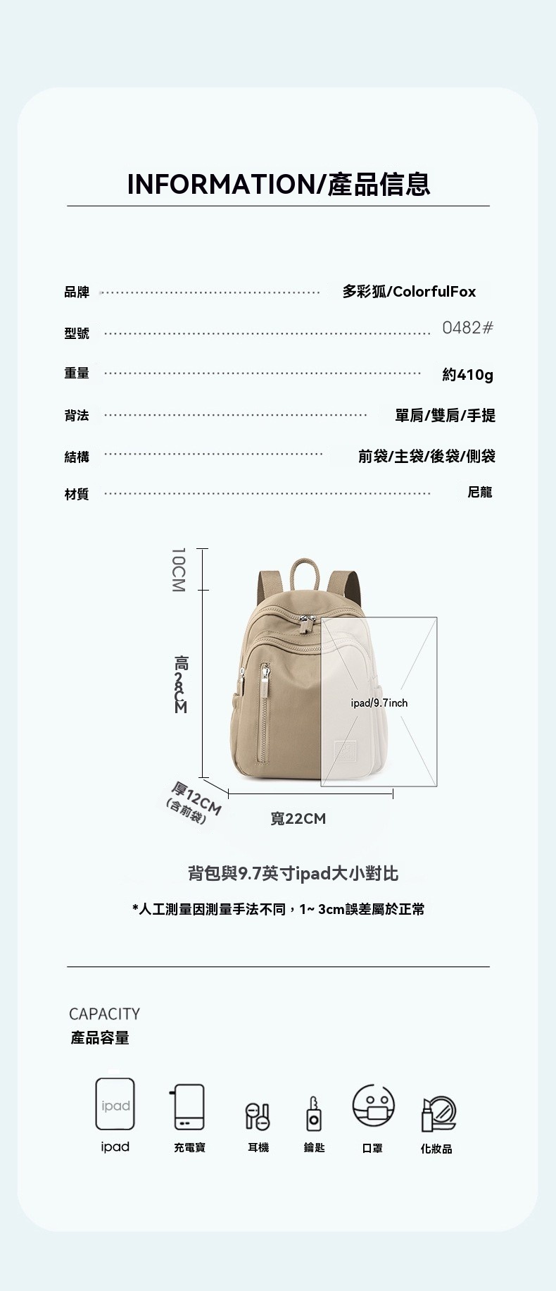 尺寸剛剛好:長22cm、寬12cm、高28cm,既能裝得下日常所需,背起來又不會太笨重。