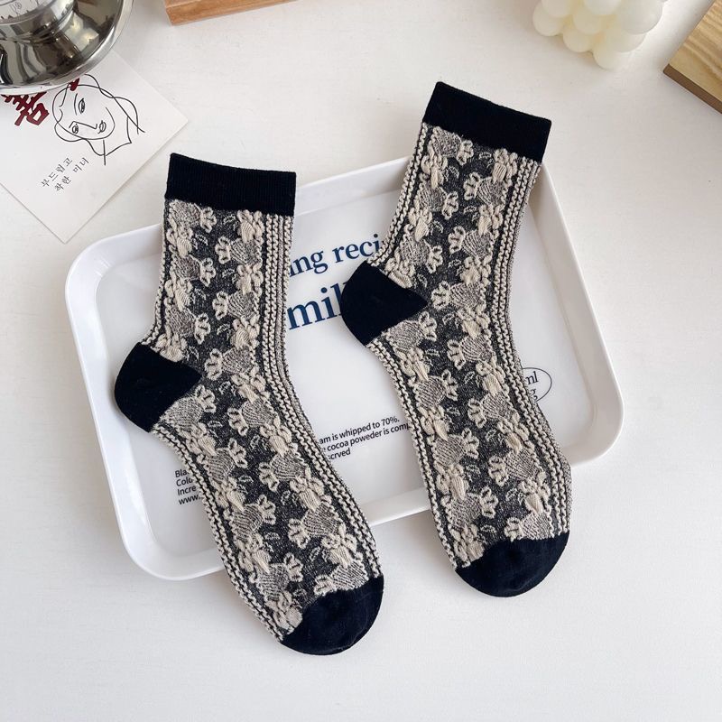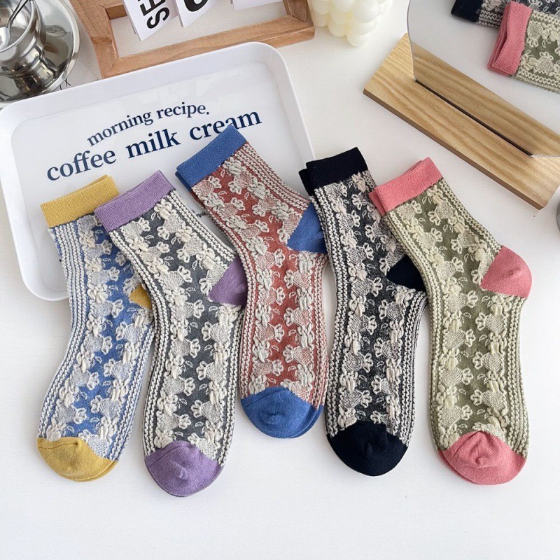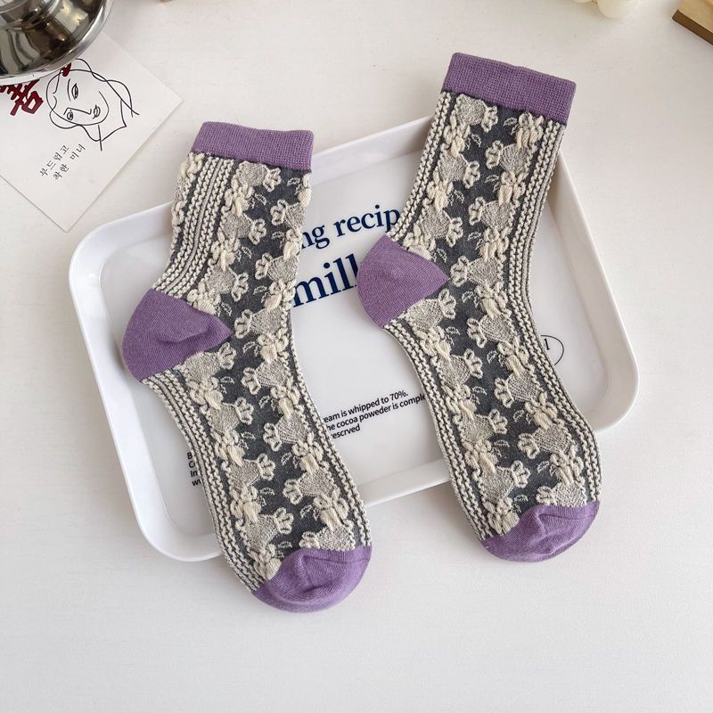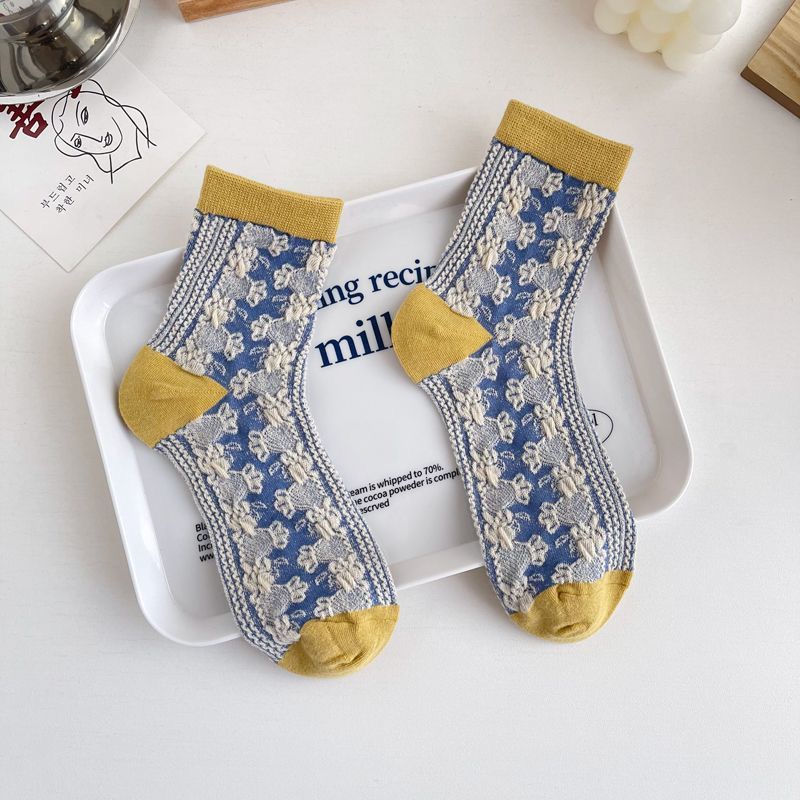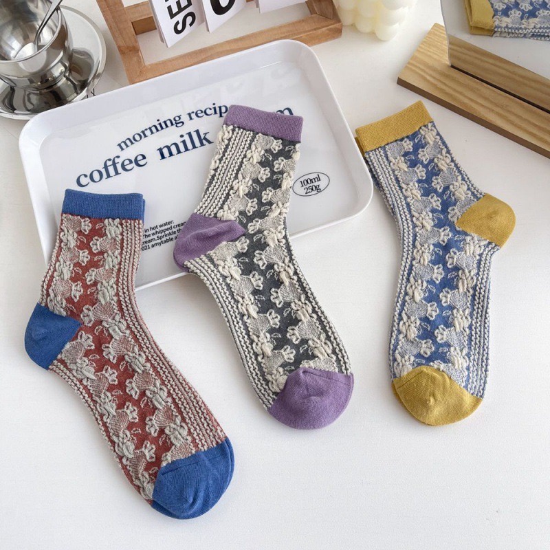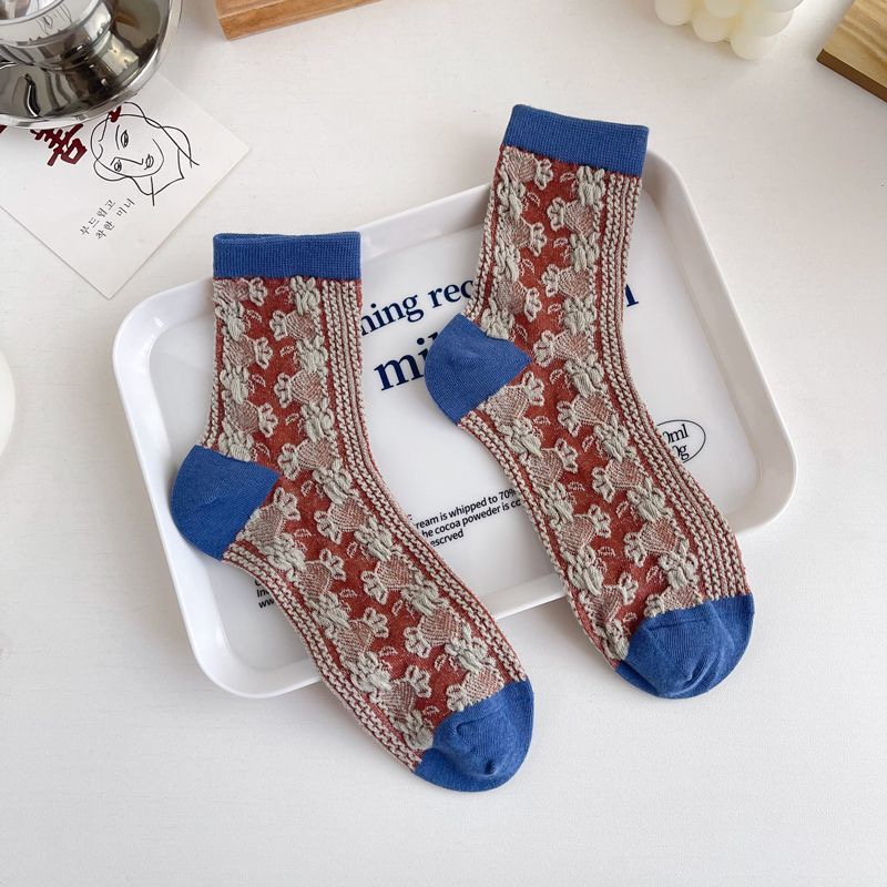 復古風襪子 中筒襪棉襪 立體彩花女襪 81