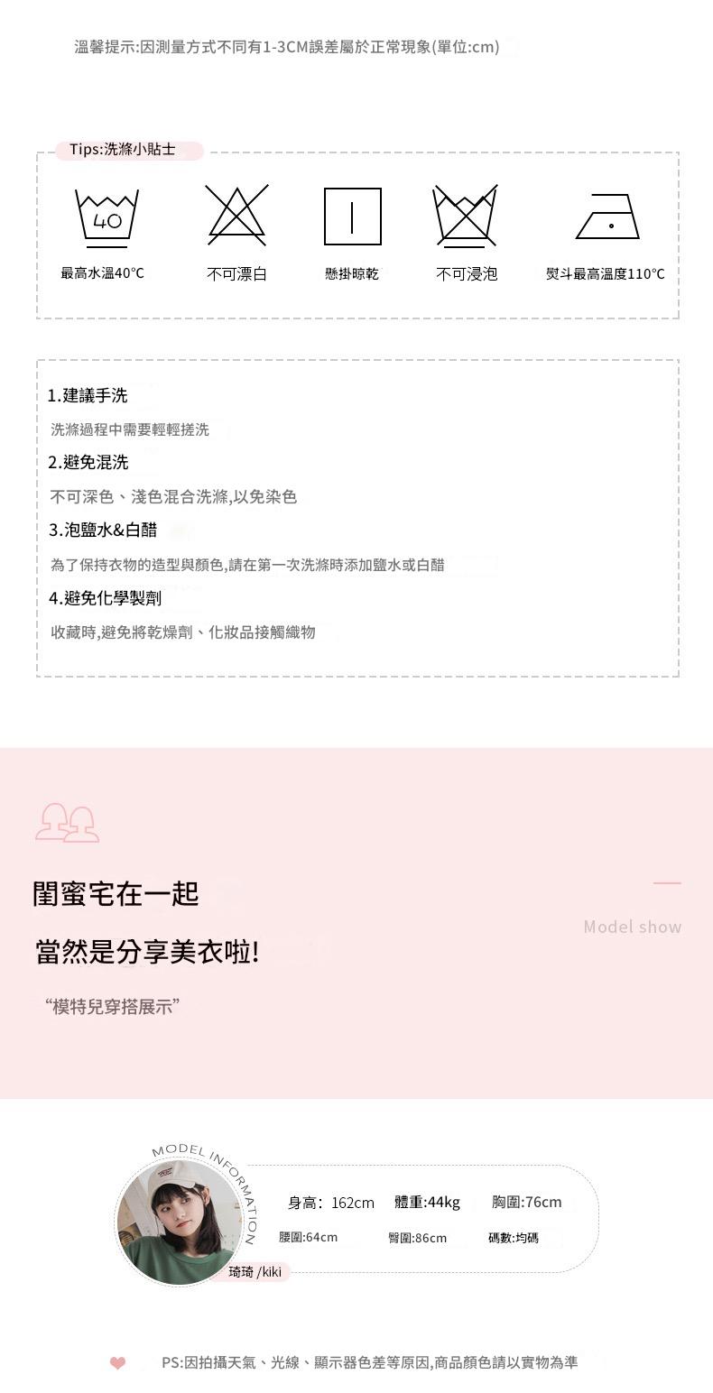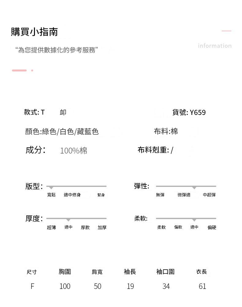尺碼 F:胸圍 100cm,肩寬 50cm,袖長 19cm,袖口圍 34cm,衣長 61cm。