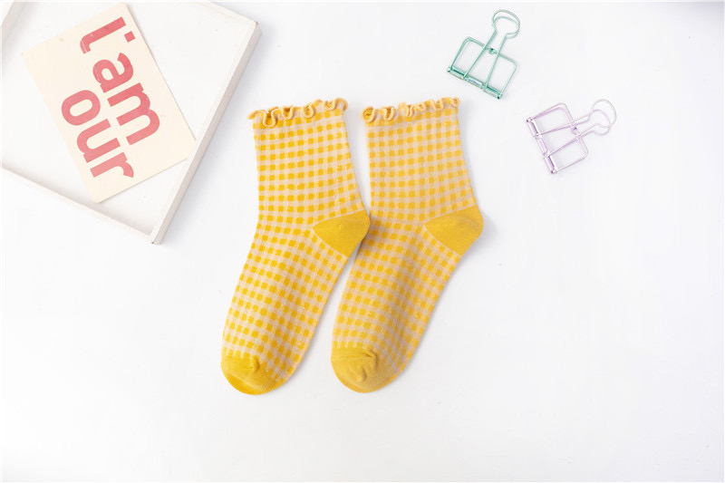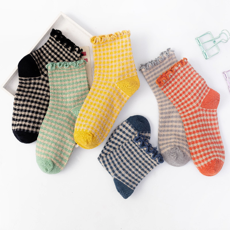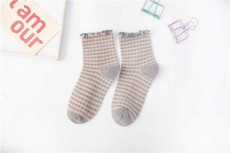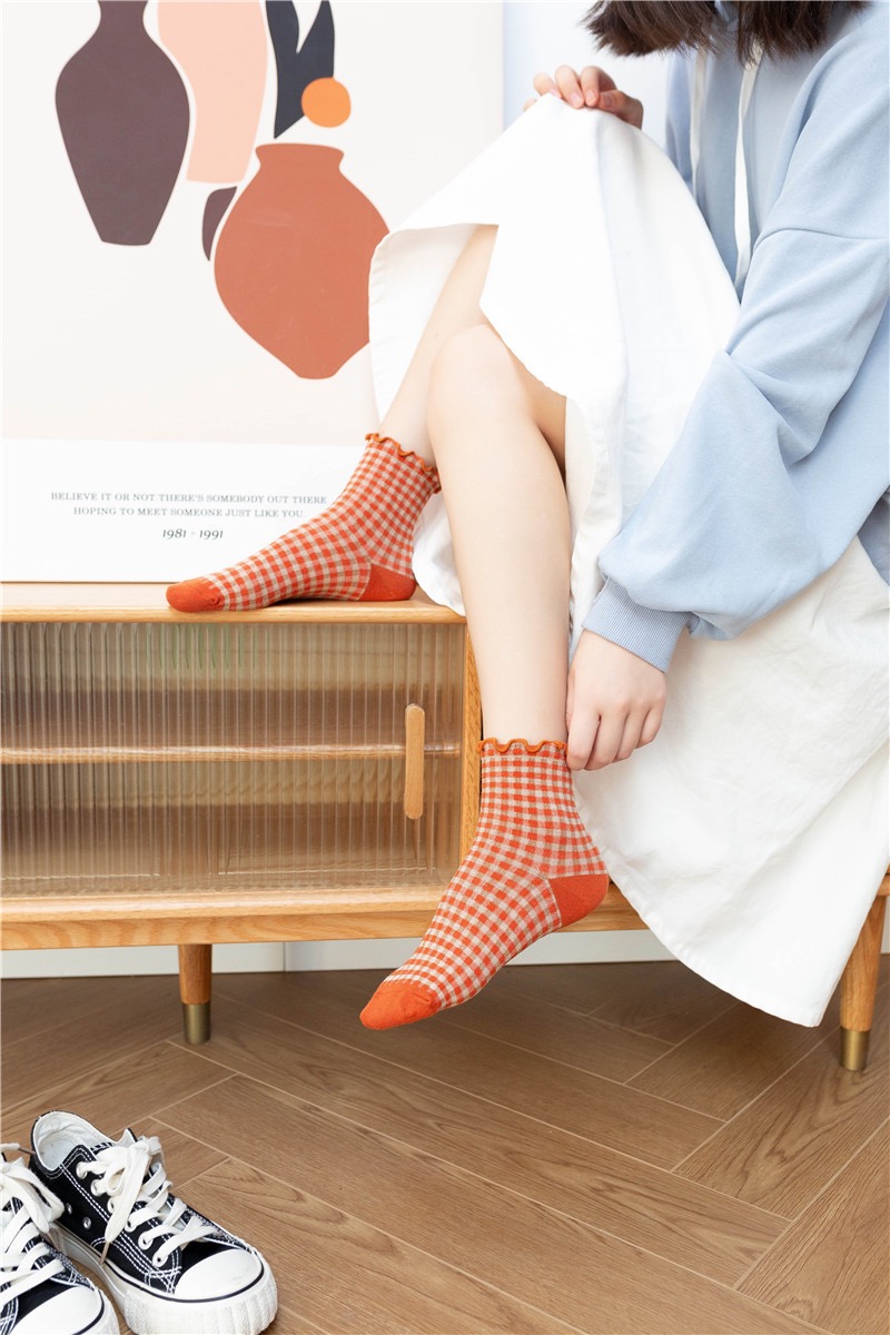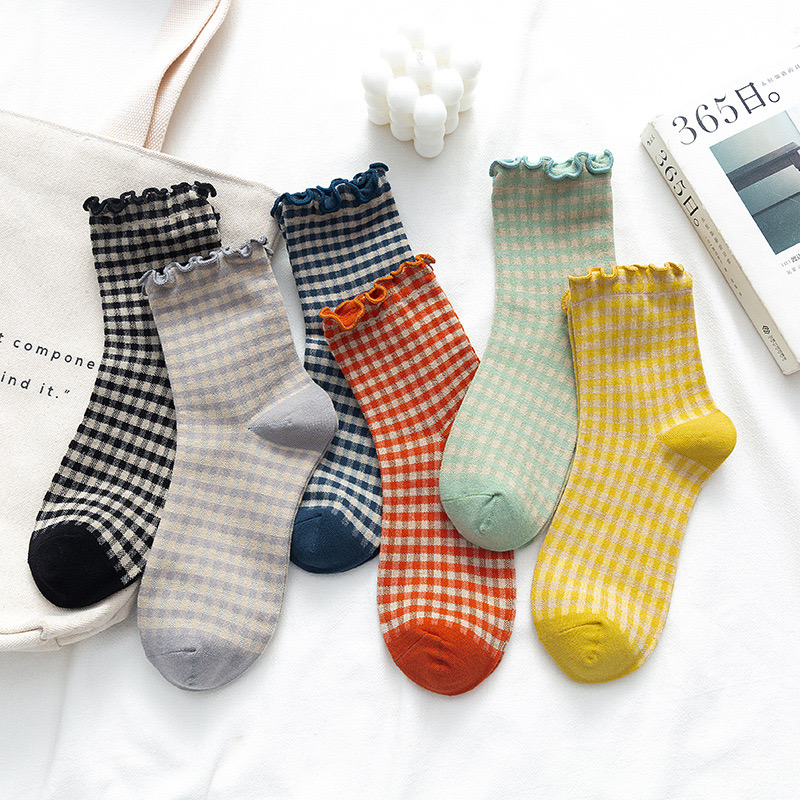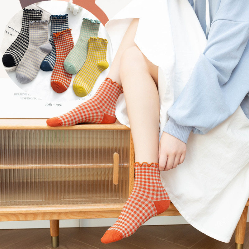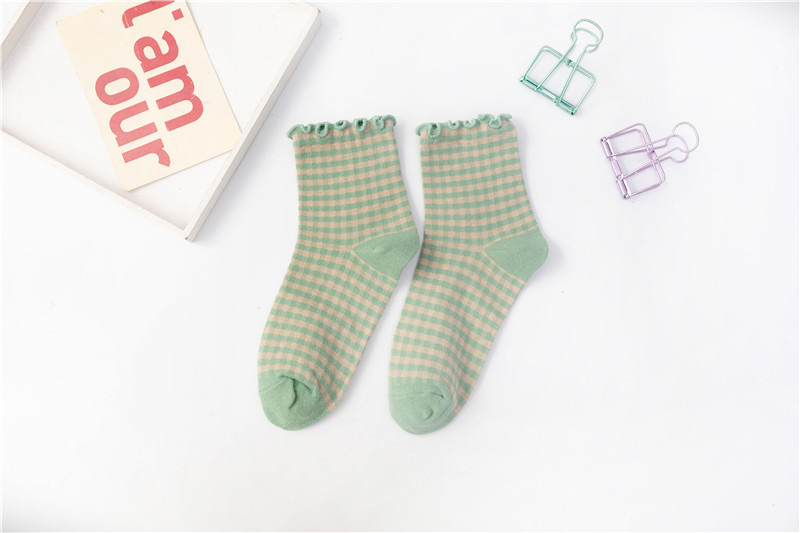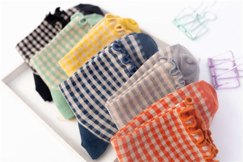 日系 方格子木耳邊 棉襪花邊森系學院風 02