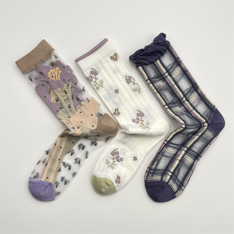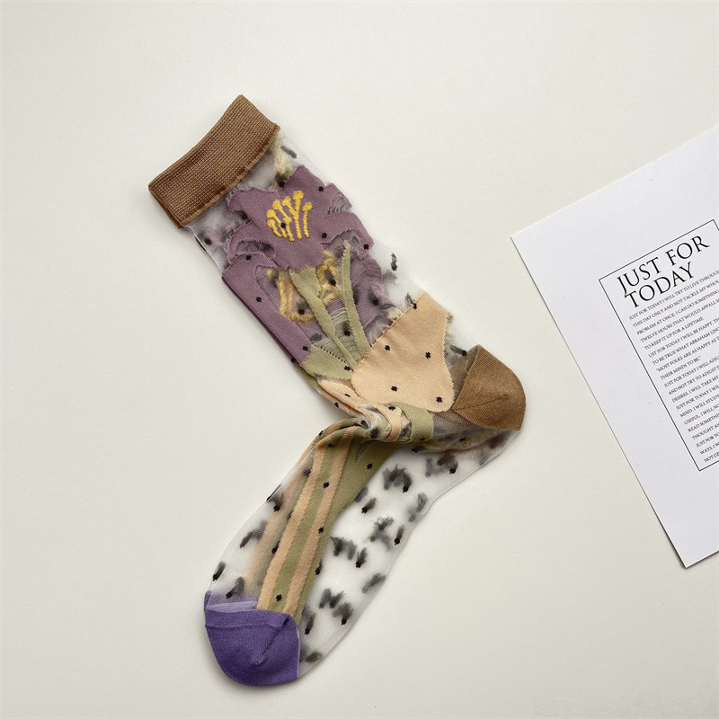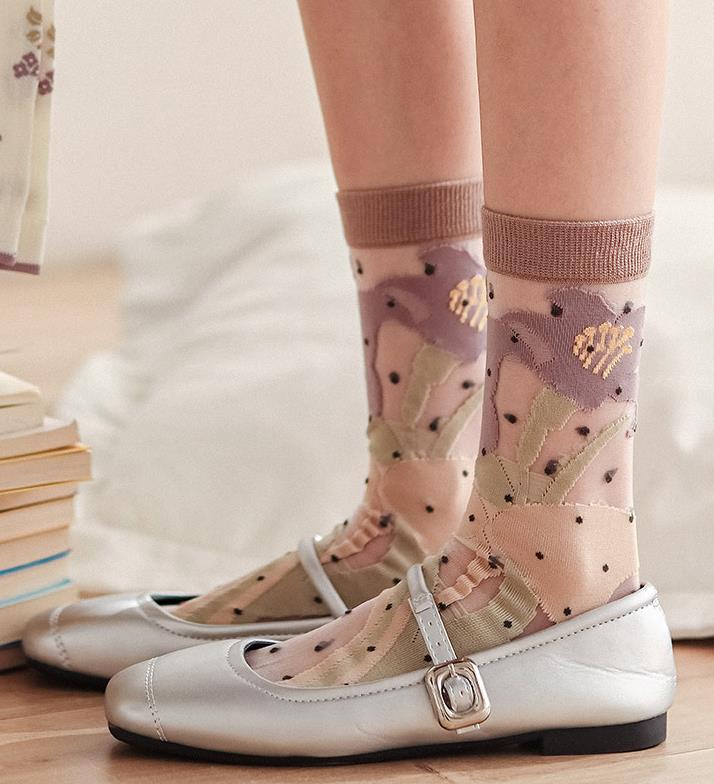玻璃絲拼接花朵中筒襪 34