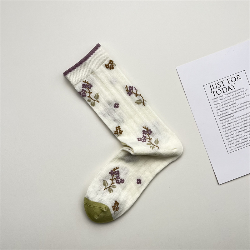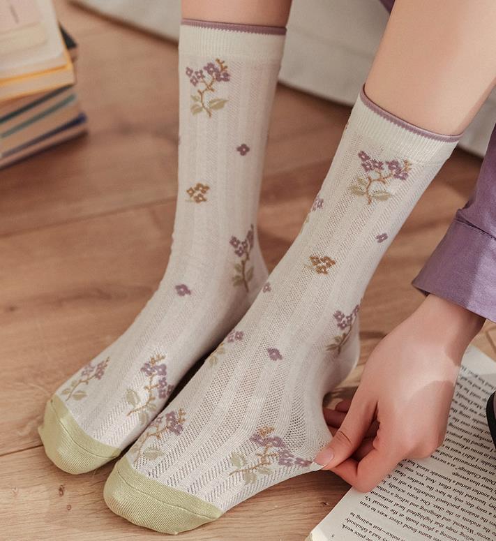 小眾文藝復古碎花中筒襪 薄款透氣卷邊花藤堆堆襪 n115