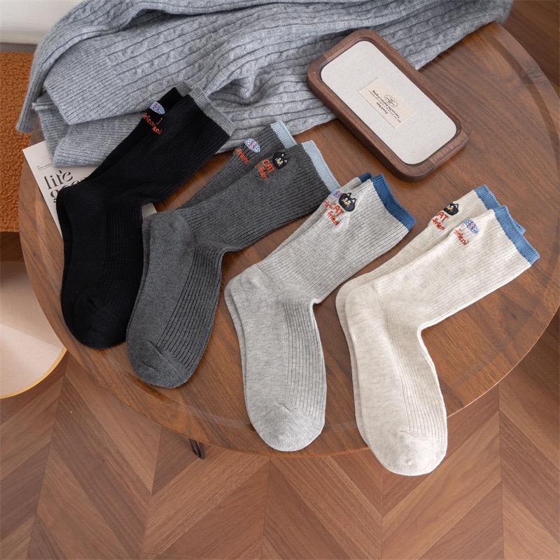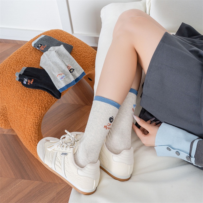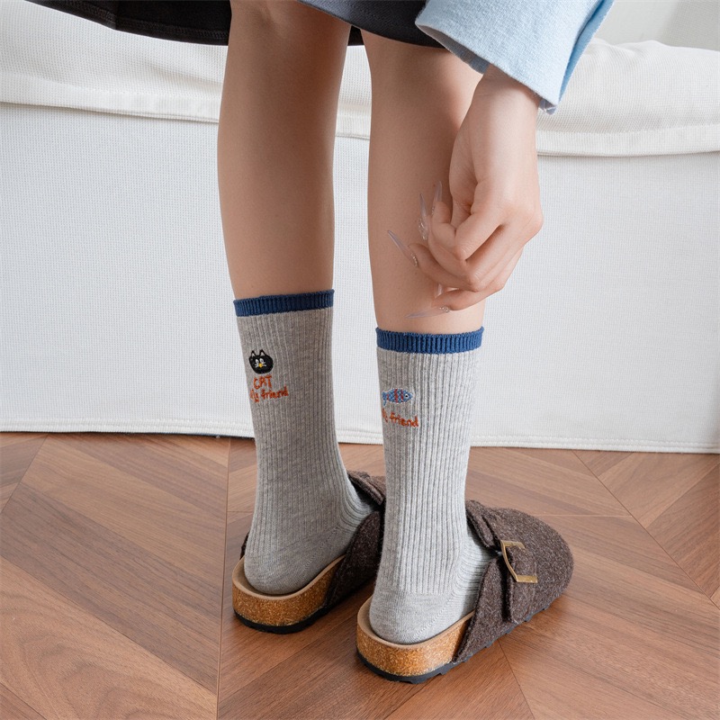 秋冬拼色AB版 刺繡小貓小魚字母 中筒襪堆堆襪 n114