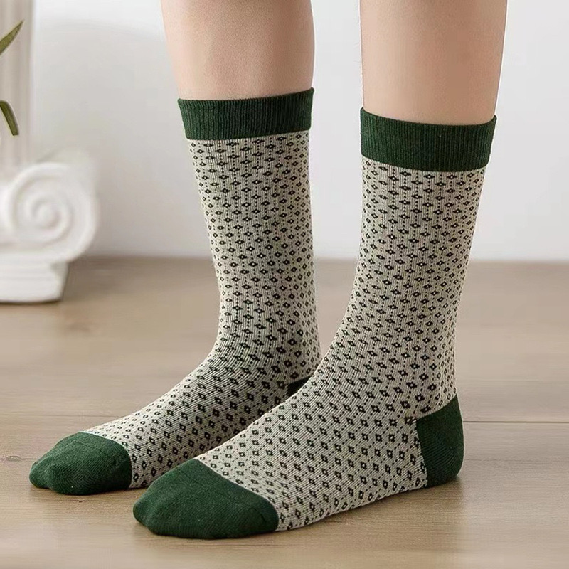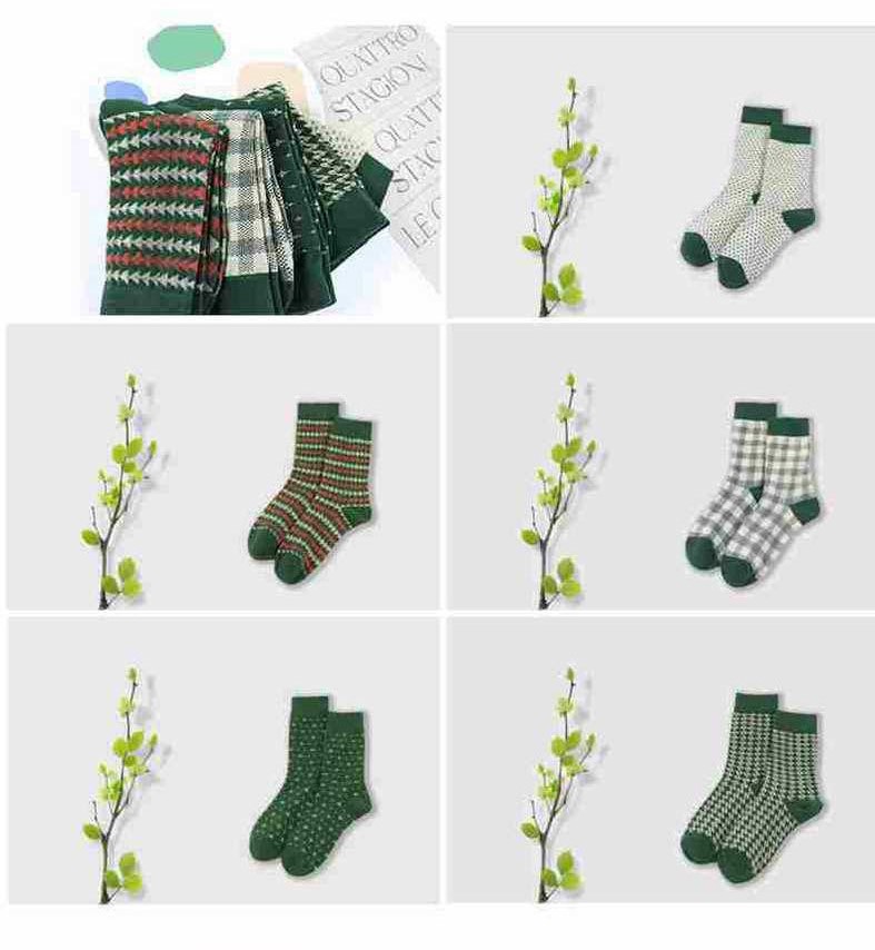 這款綠色英倫復古風的韓版中筒襪,結合了韓版的簡約潮流和英倫風格,