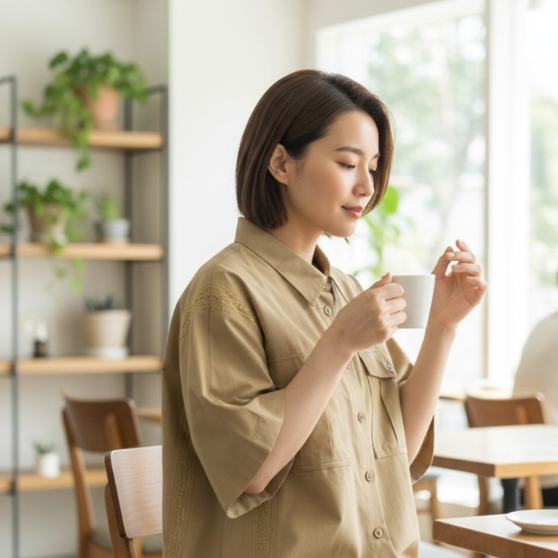 這款斜紋棉質面料打造,厚薄適中、觸感乾爽,能四季著用。細密的人字紋在光線下呈現深邃層次,展現自然且沉穩的氣質。