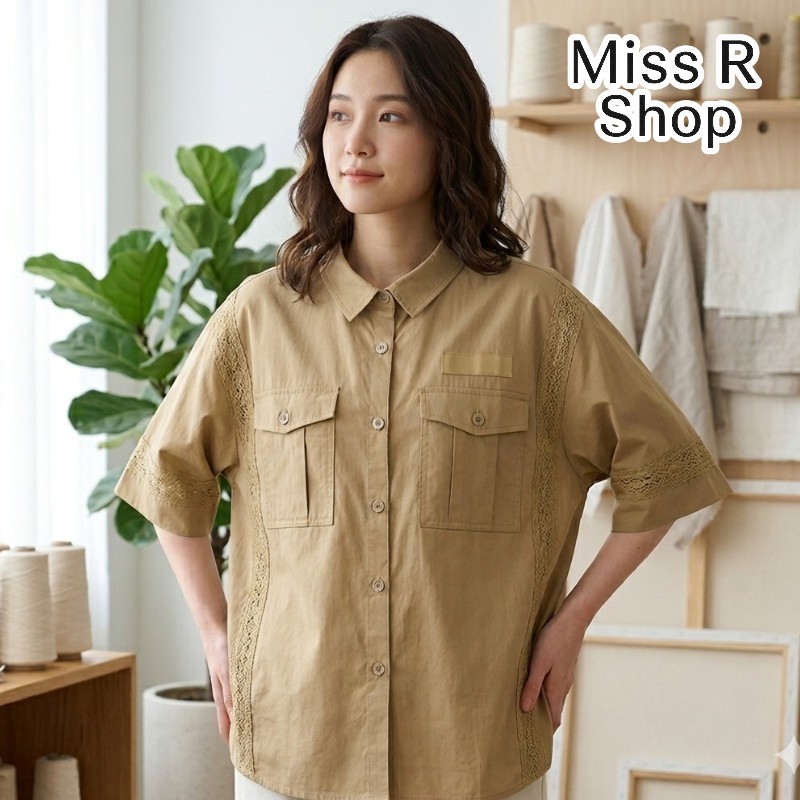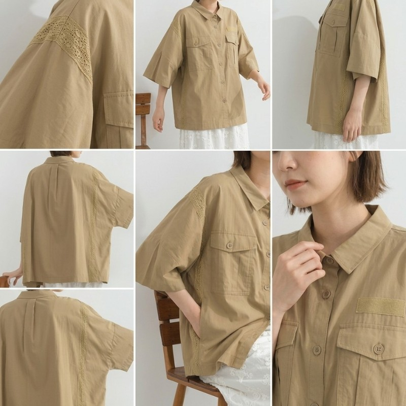 胸前以 蕾絲裝飾點綴,為略帶工裝風的布料增添柔和感,營造成熟卻輕鬆的休閒氛圍。寬鬆的版型搭配順肩剪裁,穿著舒適、活動自在。