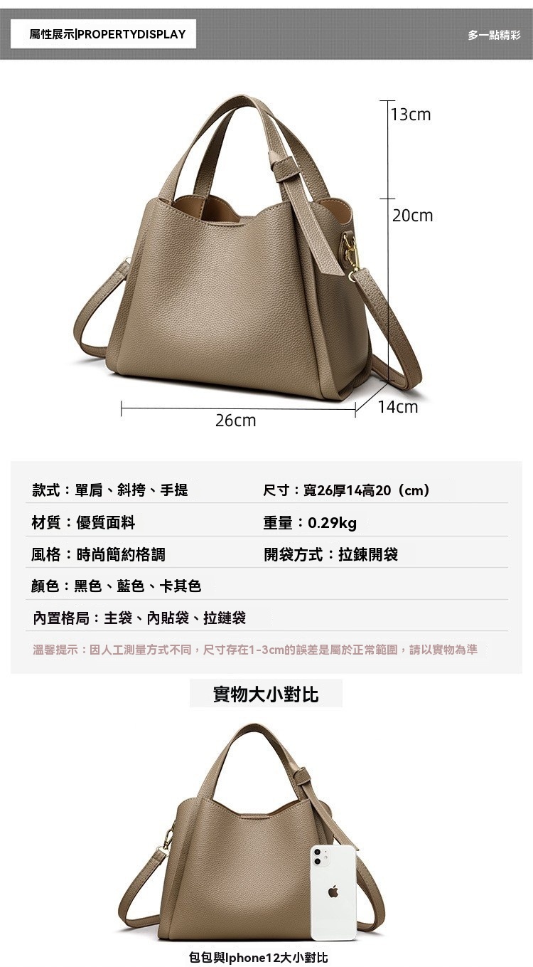 尺寸長26cm、寬14cm、高20cm,容量剛剛好,能裝下日常小物又不顯笨重。