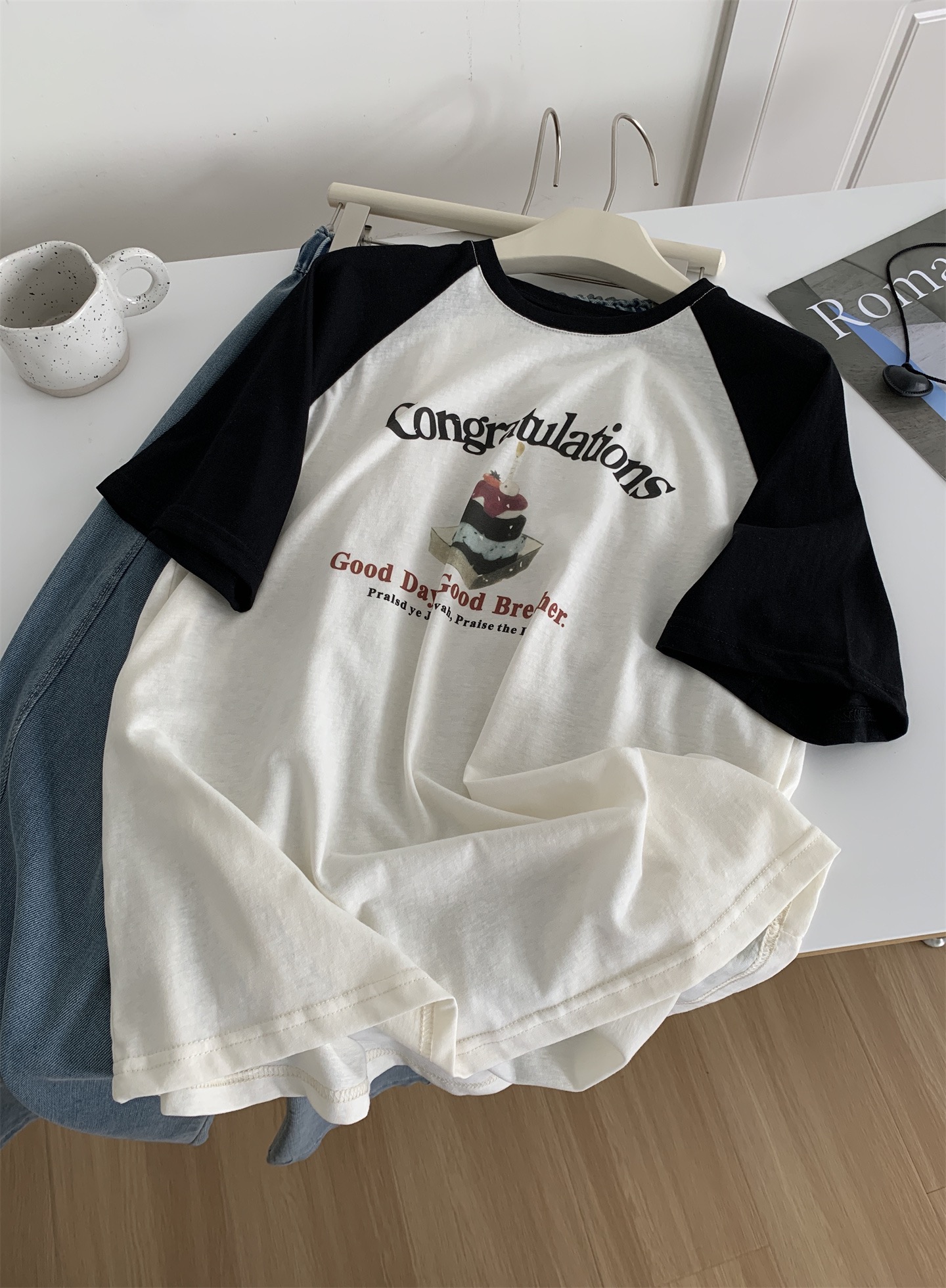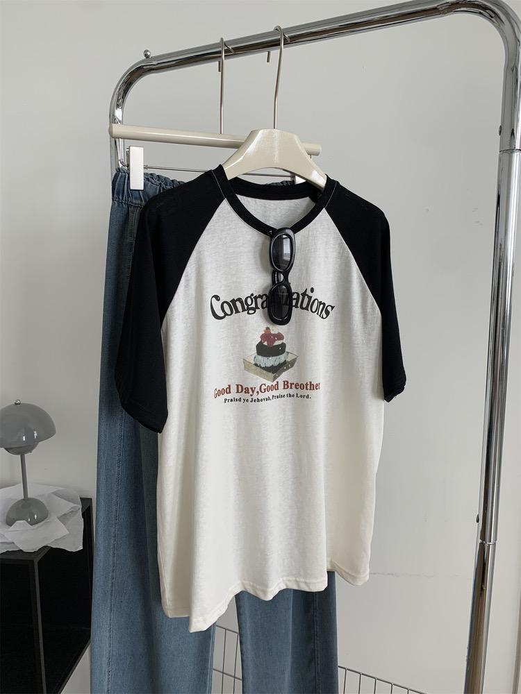 氣質寬鬆拼色印花卡通 純棉短袖T恤 735