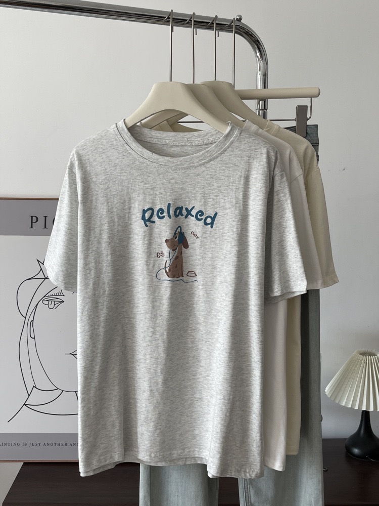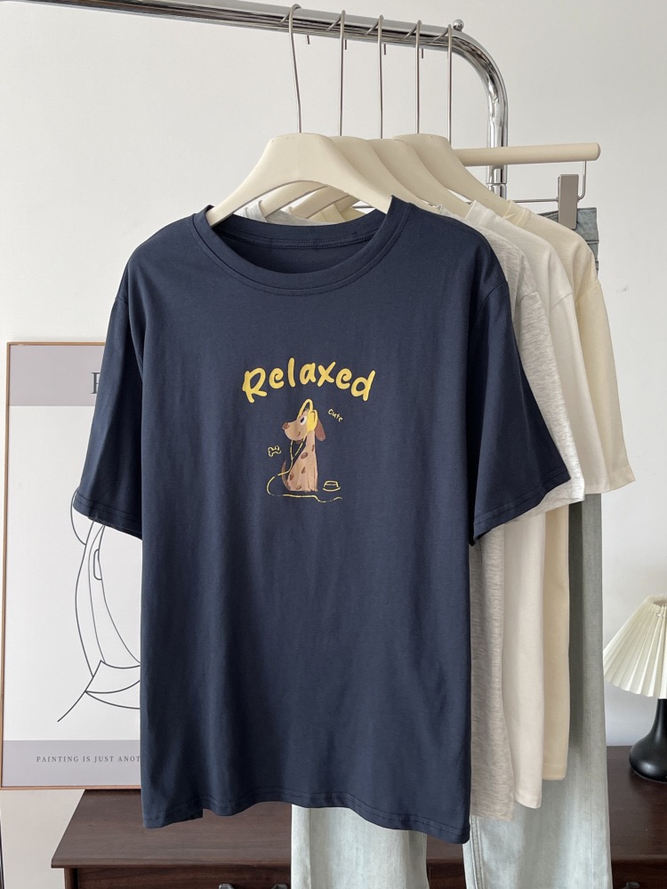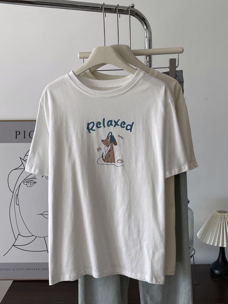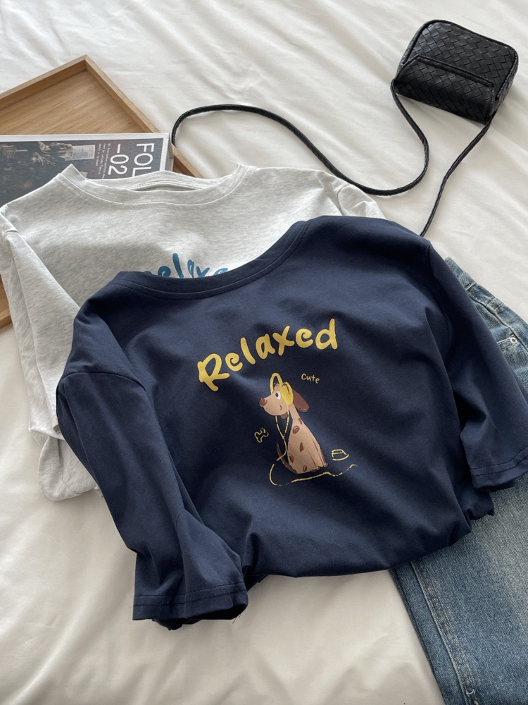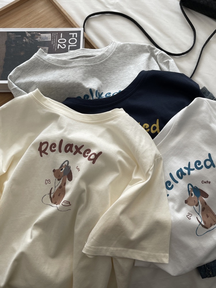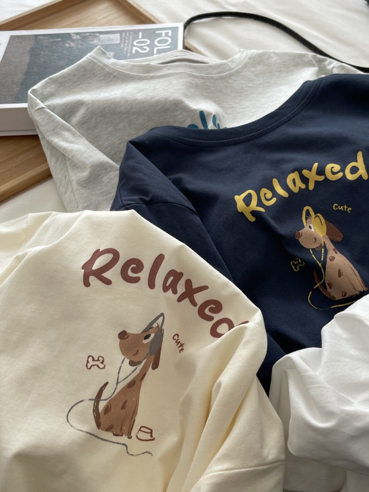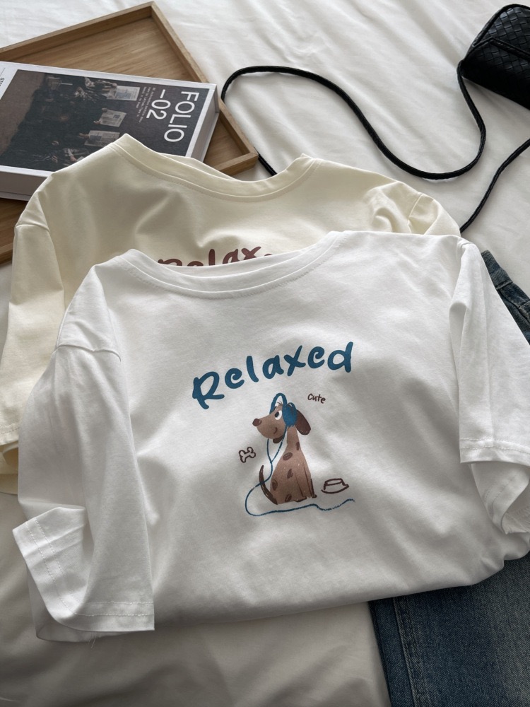 夏季日系小狗印花短袖T恤 純棉寬鬆圓領百搭 前後圖案 可愛 休閒 時尚 潮流 女上衣 n60003