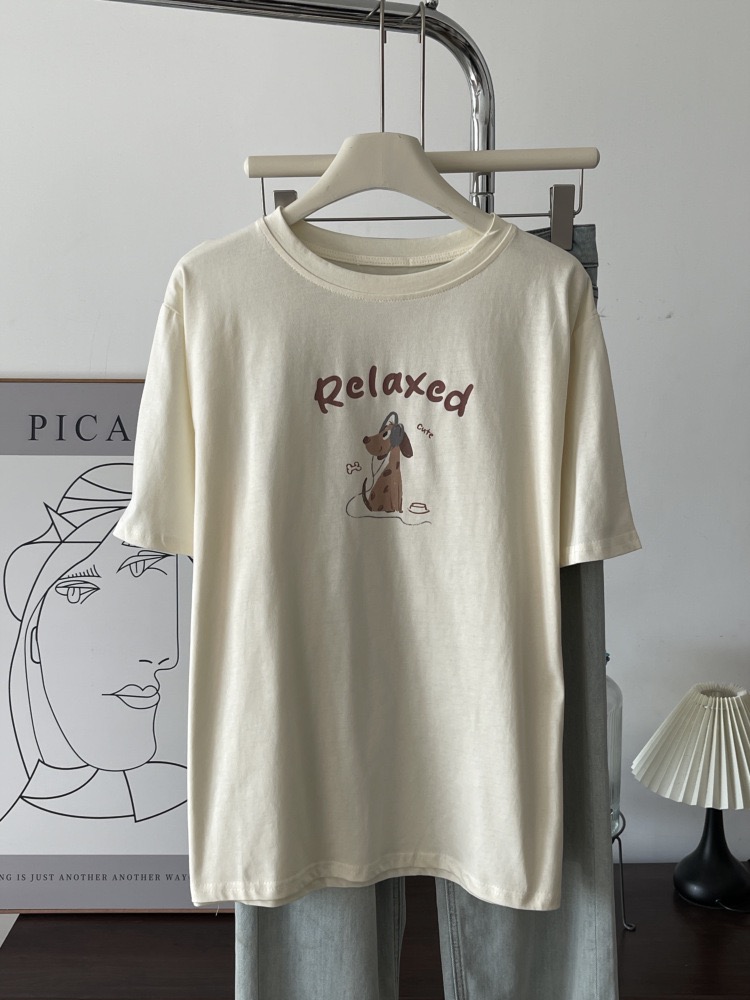 奶油杏色印花短袖T恤 女圓領寬鬆純棉 夏季薄款休閒上衣 韓版百搭 清新 氣質 時尚 潮流 n60007