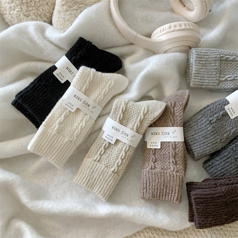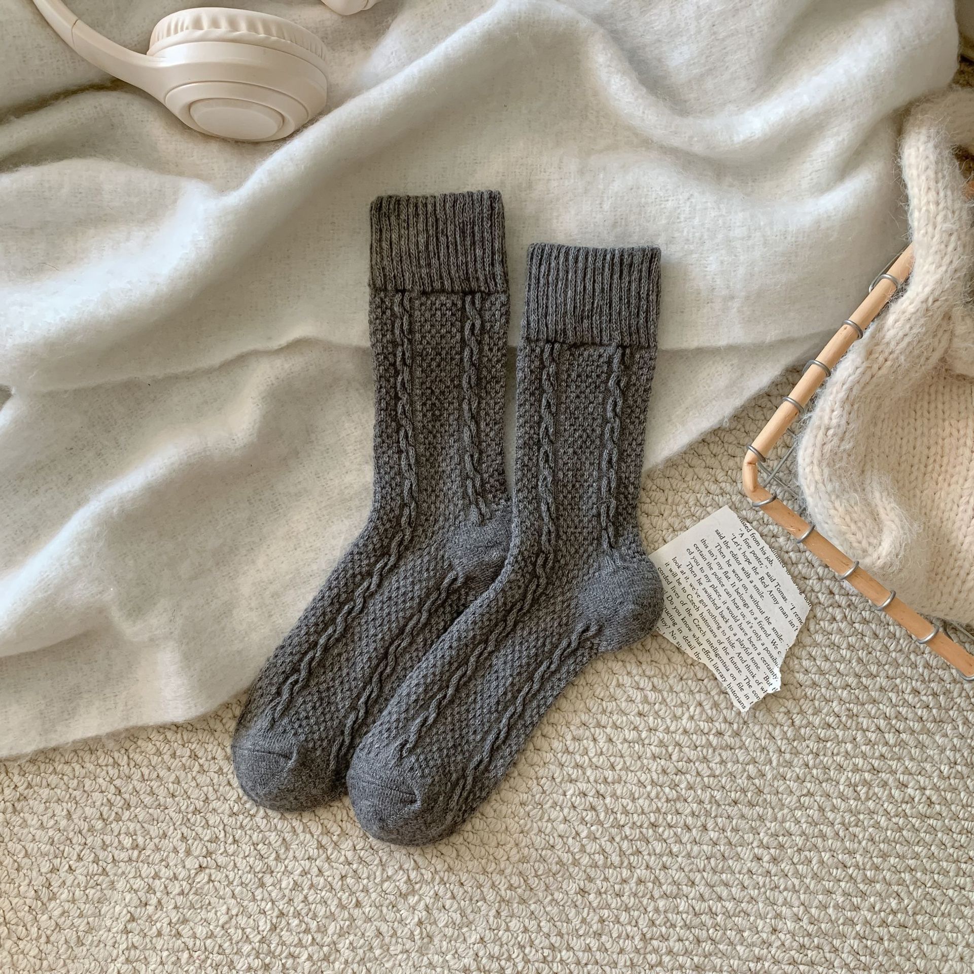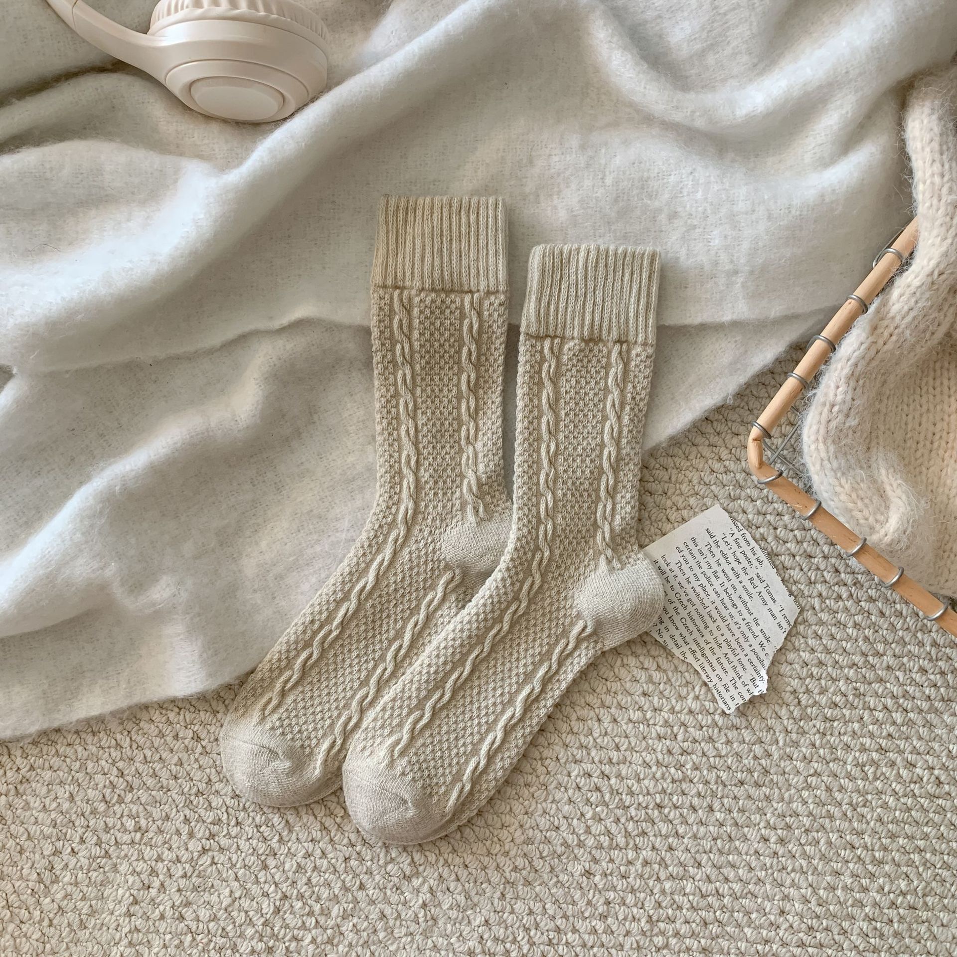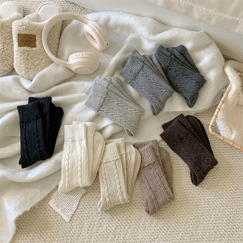麻花羊毛襪 韓版簡約 純色加厚保暖中筒堆堆襪 n117